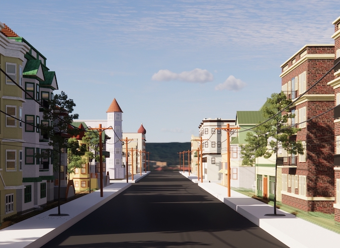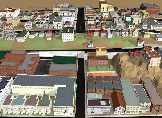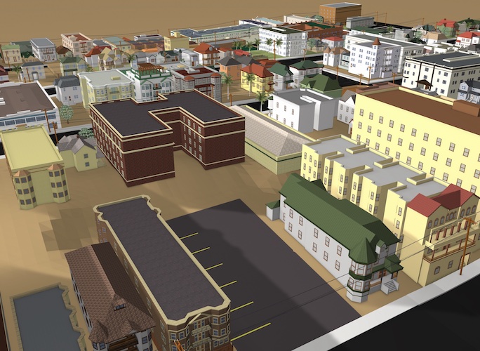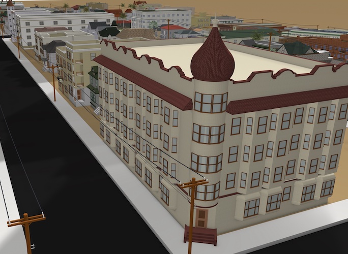 In spring 2022, the Bunker Hill Refrain team, along with Ahmanson Lab staff, researched, designed, and fabricated a 3D reconstruction of Bunker Hill from the late 1930s and early 1940s. Included in that reconstruction (as of May 2022) are 3D models of 172 buildings, terrain, and street features for twelve contiguous blocks of the historic neighborhood.