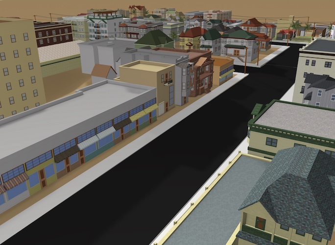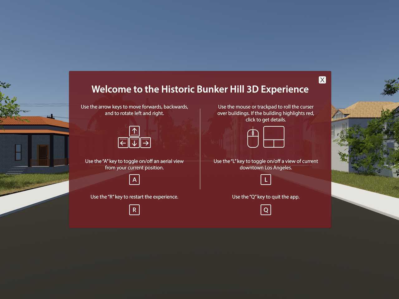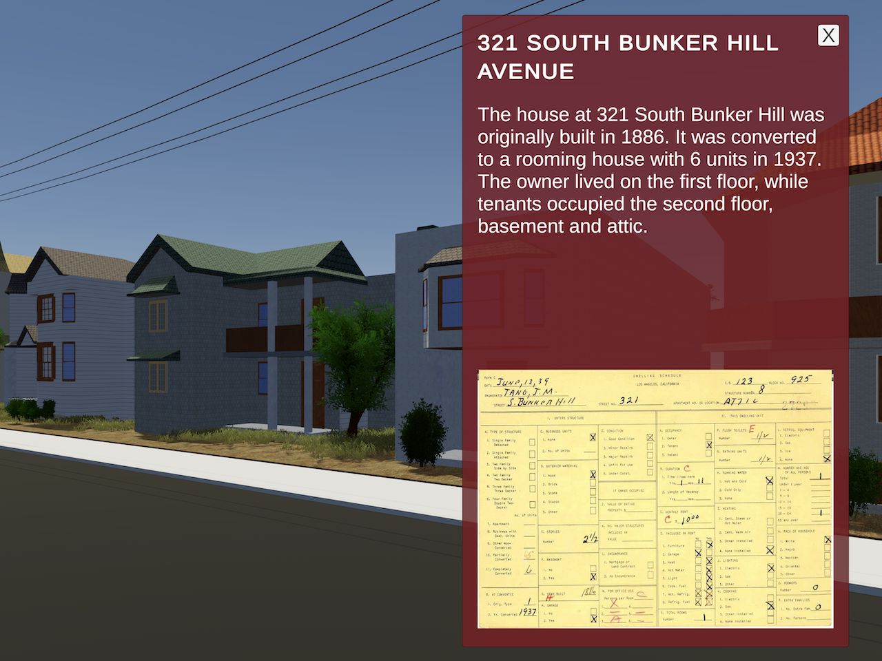 Using Unity, our team created an interactive experience of historic Bunker Hill that allows users to walk the streets of the model, click on select residences to see brief descriptions and census cards from the period and to toggle buildings from current L.A. on/off. This experience can be downloaded and viewed in both Windows and Mac.